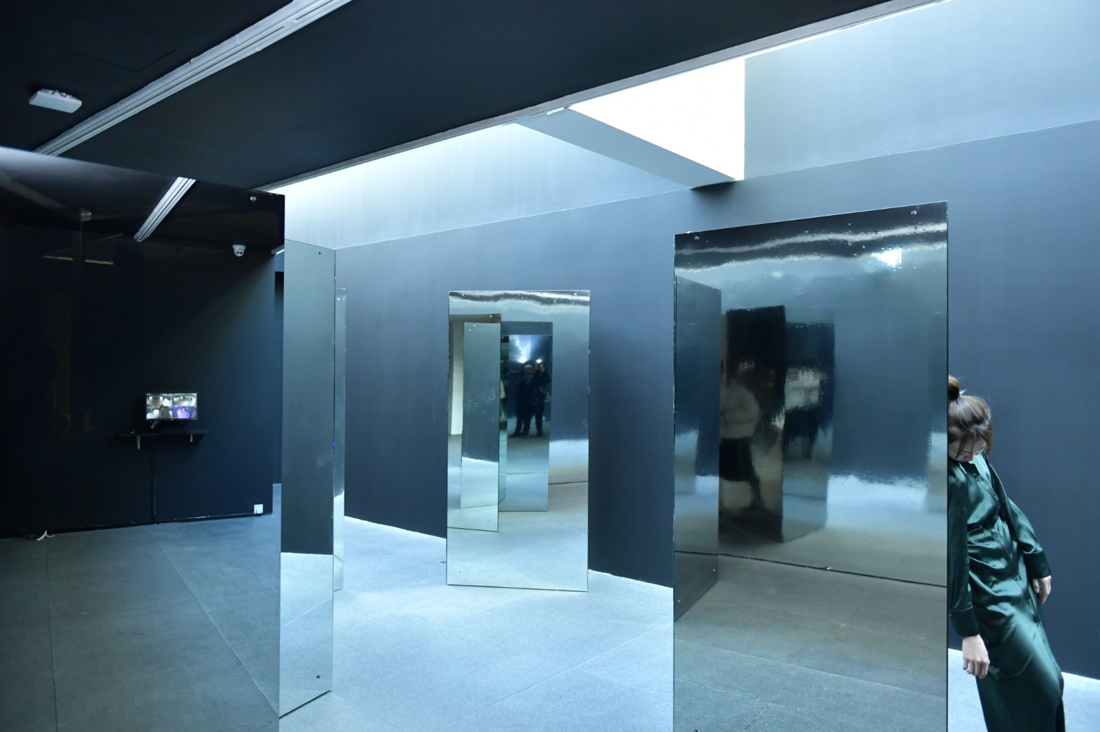 在OCAT研究中心展廳最明亮而寬闊的長(zhǎng)走廊上,紙老虎工作室借助六個(gè)鏡面反射的三棱柱營(yíng)造了一個(gè)劇場(chǎng)式的空間,邀請(qǐng)觀眾進(jìn)入并參與到劇目的演繹與發(fā)展中來(lái)。鏡面反射著“我”和周?chē)沫h(huán)境,清晰地呈現(xiàn)著“我”在環(huán)境中的位置。