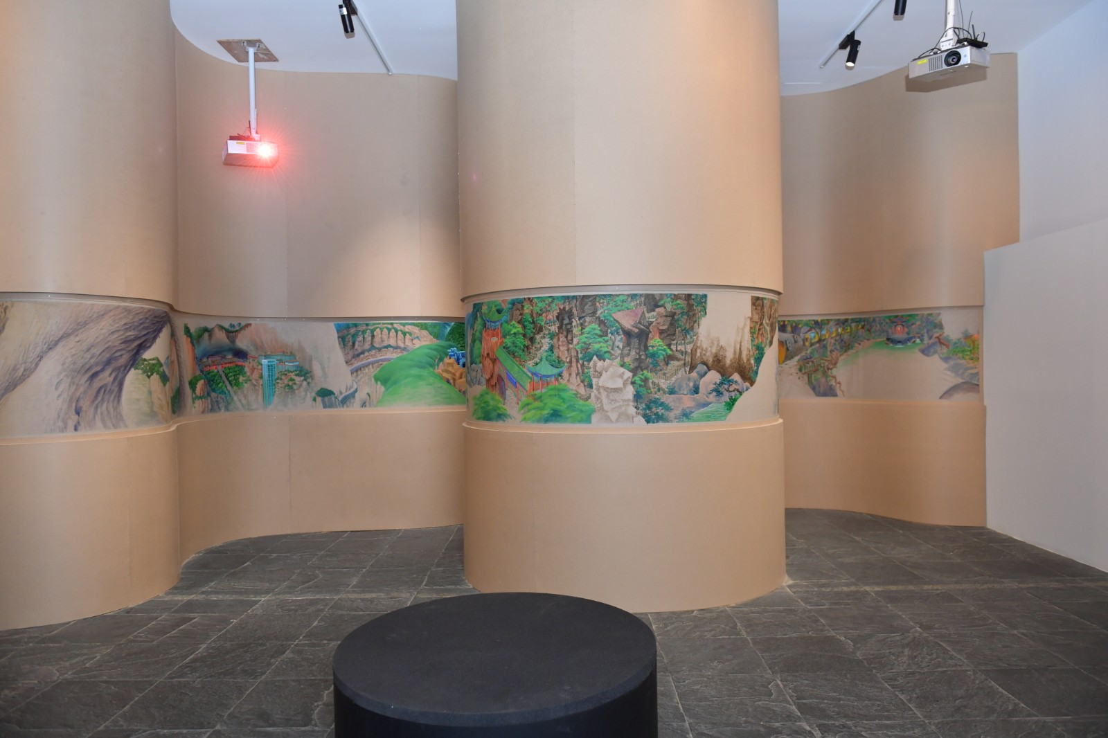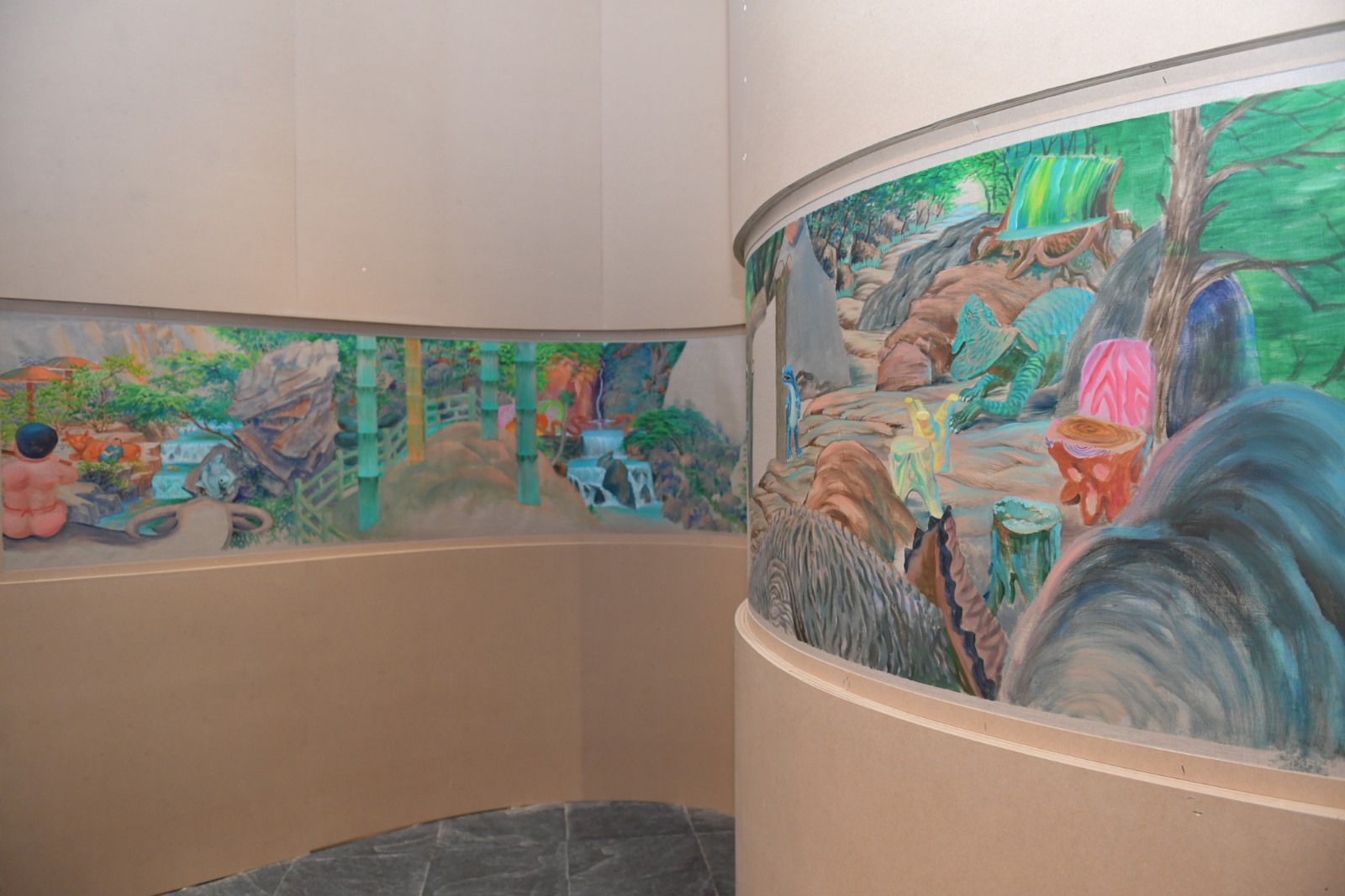 “地洞”一旁是展廳的下沉區(qū)域,這里被策展人設(shè)計(jì)為去往“桃花源”的實(shí)體路徑。梁碩的《景了個(gè)區(qū)》出現(xiàn)在這個(gè)下沉空間的一排四個(gè)口袋式的連續(xù)隔間墻面上,從空間上來(lái)說(shuō)是無(wú)比契合的?;仡櫫捍T2019年在北京公社的展覽《梁碩:景區(qū)》同樣可以見(jiàn)到這樣一種迂回的觀展路徑?!熬皡^(qū)”這個(gè)概念的提出,在藝術(shù)家看來(lái)代表著今天人們對(duì)山水的理解,這個(gè)獨(dú)特的概念跨越了自然景觀與都市空間。梁碩在自己撰文的《景了個(gè)區(qū)》中復(fù)原了一個(gè)景區(qū)籌備建立起來(lái)的小故事,承包景區(qū)改造的劉工在工期接近尾聲時(shí),看到自己的“杰作”時(shí)不由感嘆:“這些水泥造物,居然都妥妥的在那了,像是本來(lái)就是從山里長(zhǎng)出來(lái)的,那巨大的假山石和假樹(shù)根顯得造型怪異,卻頗得陳老蓮氣韻,在落日的余暉中與真山融為一體,真山也像了假山……”[6]景區(qū)的建立勢(shì)必意味著人工、商業(yè)、消費(fèi)對(duì)自然景觀的直接侵入與改造,空間、審美、意識(shí)形態(tài)等一系列問(wèn)題由此發(fā)生。