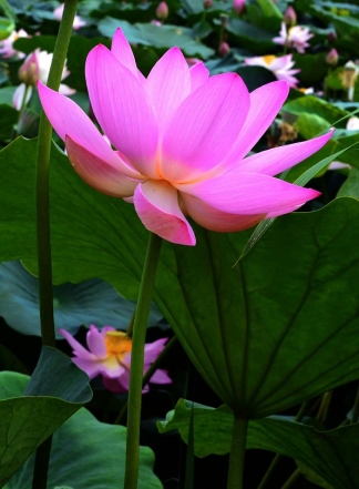 荷花凋謝前,花中心蕊開(kāi)始長(zhǎng)蓮蓬。秋天花瓣脫落,便留下蓮蓬,形狀似漏斗。蓬內(nèi)長(zhǎng)著蓮子,成熟后顆顆飽滿凸起。荷梗是一枝中空管狀長(zhǎng)梗,其外表生毛刺。荷花、荷蓋、蓮蓬都長(zhǎng)在梗的頂端,夏天干挺,秋后干扁,并會(huì)曲折而斷。尖葉是葉蓋的初長(zhǎng)之葉,兩頭尖,卷曲成筒形,梗短而細(xì)小,很優(yōu)美。