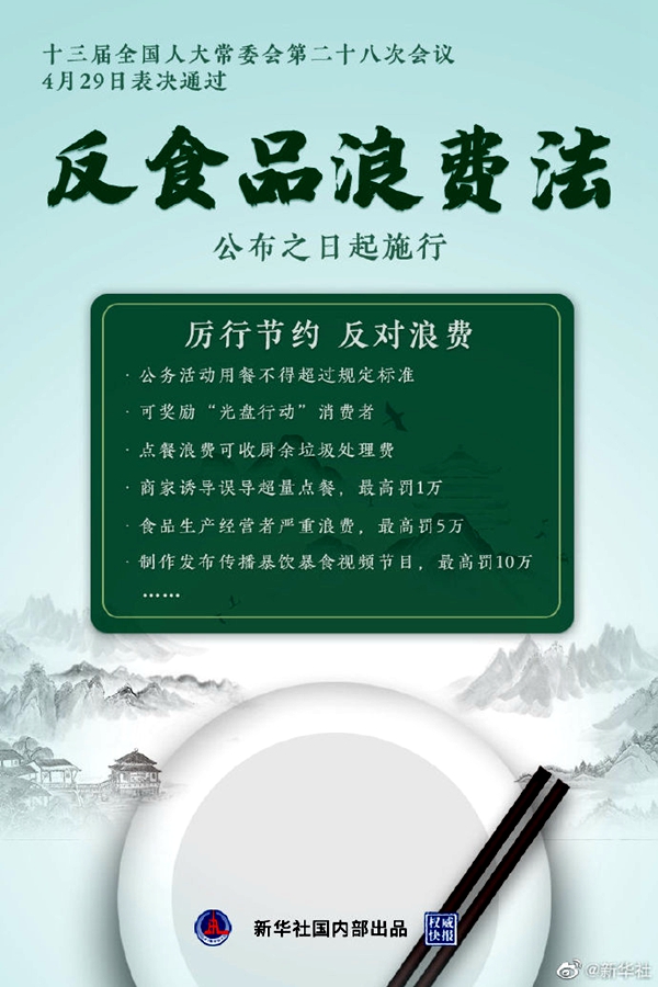 十三屆全國人大常委會第二十八次會議29日表決通過反食品浪費法,自公布之日起施行。弘揚傳統(tǒng)美德、保障糧食安全,防止食品浪費從此有法可依。(新華社記者羅沙 任沁沁 海報設計楊軼群)