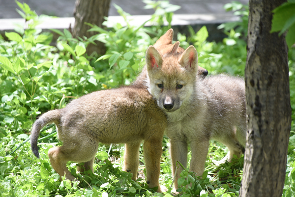 比起 “獨生子”的小羚羊,在狼散放區(qū)出生的小家伙們可真稱得上是大家庭了。同樣是四月份出生的狼崽們多達13只,新生娃數(shù)量目前在園里遙遙領(lǐng)先,他們分別來自于四個不同家庭,最多的一窩小狼崽有兄弟姐妹6個,最少的也是雙胞胎。這13只小狼崽斷奶后過起了集體生活,每天一起吃飯,一起睡覺,一起學習,一起玩耍,簡直不要太熱鬧。尤其是白天在室外運動場活動時,小狼崽們時而分成幾個小組活動,時而湊在一起,像一堆毛球擠成一團。在這其中有一只小狼不到滿月就顯示出了狼王的天性,小尾巴翹的高高的,一幅天不怕地不怕的樣子誰都敢挑戰(zhàn),勇敢值爆表。飼養(yǎng)員說它具有狼王潛質(zhì),幾年后有可能成為新的狼王。