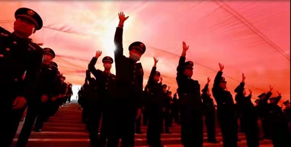 伴隨著激昂的樂(lè)曲,一面400平方米的巨幅黨旗緩緩展開,面向鮮紅的黨旗,在場(chǎng)的黨員干部和居民群眾心潮澎湃。100名黨員整齊列隊(duì),在領(lǐng)誓人的帶領(lǐng)下舉起右拳,莊嚴(yán)宣誓,重溫入黨誓詞,回望入黨初心,抒發(fā)對(duì)黨忠誠(chéng)的意志和信念。