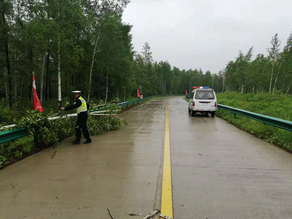 交警大隊派出警力增援北極中隊,擴(kuò)大巡邏范圍,及時排查發(fā)現(xiàn)G111、G331國道、景區(qū)周邊路段交通隱患。在北極村至北紅村路段,發(fā)現(xiàn)由于暴雨沖刷,該路段3處山石、樹枝堆積在路面,2處樹木刮倒,嚴(yán)重影響路面通行安全。巡邏民警立即對險情進(jìn)行處置。針對3處漫水較為嚴(yán)重區(qū)域,設(shè)置警戒線等警示標(biāo)志,告知過往車輛通行路況,提醒車輛減速慢行,同時通知相關(guān)部門及時處置。
