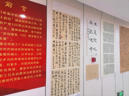據(jù)了解,此次活動(dòng)共入展攝影作品41幅、書(shū)法作品15幅、繪畫(huà)作品13幅、手工制作5件、詩(shī)歌2首及微視頻4部,其中部分作品在該院門(mén)診五樓進(jìn)行了展示。攝影作品《守護(hù)》,作者是省醫(yī)院兒科副主任汪琪,通過(guò)鏡頭展現(xiàn)了醫(yī)務(wù)工作者的日常忙碌,及不知疲倦、一絲不茍的內(nèi)心世界;書(shū)法作品《紅船精神》,作者是省醫(yī)院南崗院區(qū)泌尿外一科主任楚寧,筆法嫻熟、清秀雋永,字里行間體現(xiàn)出堅(jiān)定理想、百折不撓的奮斗精神;書(shū)法作品《不忘初心》聯(lián)句,作者是省醫(yī)院南崗院區(qū)普外科姜峰奇,古樸自然,一顆紅心永向黨;繪畫(huà)作品《一唱雄雞天下白》,作者是省醫(yī)院退休老干部張克起,作品直接用畫(huà)面抒發(fā)革命浪漫主義情懷;繪畫(huà)作品《江山多嬌》,作者是省醫(yī)院退休老職工賈雨虹,用嬌美的花朵為黨的百年華誕獻(xiàn)禮。