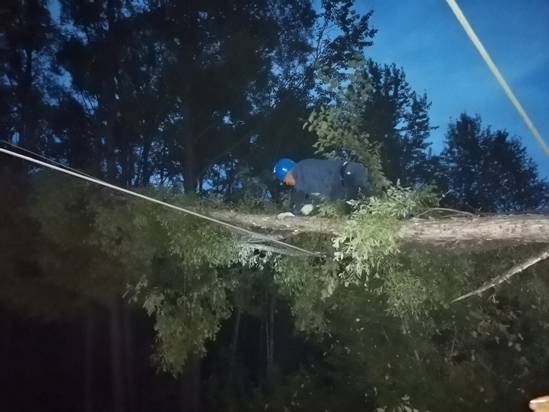 飛機巡查發(fā)現(xiàn)的呼碧線128號電線桿和129號電線桿之間線路故障處,由呼中輸電運檢班組負責(zé)搶修,需搶修人員步行穿過密林和水道,經(jīng)過1個多小時的艱難跋涉方能到達,現(xiàn)場電線上掛著一棵直徑40多厘米的風(fēng)倒樹,導(dǎo)致電線破損,搶修人員將風(fēng)倒樹用手鋸切割移除,并對破損電線進行補強,截至21時30分,呼碧線兩處故障全部搶修完畢,呼中區(qū)陸續(xù)完成供電。