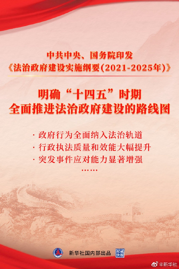 中共中央、國務(wù)院近日印發(fā)的《法治政府建設(shè)實(shí)施綱要(2021——2025年)》確立了今后五年法治政府建設(shè)的總體目標(biāo),明確到2025年,政府行為要全面納入法治軌道。綱要還提出,著力實(shí)現(xiàn)行政執(zhí)法水平普遍提升,努力讓人民群眾在每一個(gè)執(zhí)法行為中都能看到風(fēng)清氣正、從每一項(xiàng)執(zhí)法決定中都能感受到公平正義。(新華社記者白陽 海報(bào)設(shè)計(jì)楊軼群)