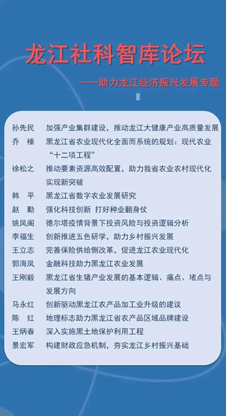 省經(jīng)濟(jì)學(xué)會會長、哈爾濱商業(yè)大學(xué)黨委書記孫先民教授結(jié)合龍江老齡化問題,從產(chǎn)業(yè)集群視角積極為龍江大健康產(chǎn)業(yè)高質(zhì)量發(fā)展建言獻(xiàn)策。省經(jīng)濟(jì)學(xué)會副會長、黑龍江大學(xué)經(jīng)濟(jì)與工商管理學(xué)院黨委書記喬榛教授從國家糧食安全政治責(zé)任和促進(jìn)農(nóng)業(yè)高質(zhì)量發(fā)展兩方面,對龍江現(xiàn)代農(nóng)業(yè)“十二項(xiàng)工程”進(jìn)行全面系統(tǒng)的剖析。省社會科學(xué)院農(nóng)村發(fā)展研究所所長趙勤教授分析了科技創(chuàng)新對“現(xiàn)代種業(yè)提升工程”的重要性。中共黑龍江省委黨校王炳春研究員指出了龍江在推進(jìn)“黑土地保護(hù)利用工程”中存在的問題,并提出構(gòu)建保護(hù)利用黑土地的長效機(jī)制和保護(hù)措施。哈爾濱工程大學(xué)經(jīng)濟(jì)管理學(xué)院馬永紅教授指出,創(chuàng)新驅(qū)動能夠有效推動“農(nóng)產(chǎn)品加工業(yè)升級工程”。東北林業(yè)大學(xué)經(jīng)濟(jì)管理學(xué)院陳紅教授圍繞“農(nóng)業(yè)品牌創(chuàng)建工程”,指出龍江地理標(biāo)志農(nóng)產(chǎn)品區(qū)域品牌建設(shè)存在的問題,并提出相應(yīng)對策。黑龍江省產(chǎn)權(quán)交易集團(tuán)董事會秘書徐松之提出,要充分發(fā)揮市場中要素資源的配置作用,提高要素資源配置效率。省經(jīng)濟(jì)學(xué)會副會長,哈商大經(jīng)濟(jì)學(xué)院院長韓平教授提出,打造龍江數(shù)字農(nóng)業(yè)要通過推動農(nóng)產(chǎn)品流通數(shù)字化、構(gòu)建農(nóng)業(yè)大數(shù)據(jù)體系、完善數(shù)字化基礎(chǔ)設(shè)施等多條路徑。哈商大金融學(xué)院院長姚鳳閣教授提出,疫情下投資風(fēng)險(xiǎn)與投資邏輯都發(fā)生了變化,其中對農(nóng)業(yè)企業(yè)的不利沖擊已經(jīng)波及到全產(chǎn)業(yè)鏈。哈爾濱金融學(xué)院投資保險(xiǎn)系主任王立志教授提出,通過金融供給側(cè)改革,利用“保險(xiǎn)+期貨”的方式,能夠顯著降低上市生產(chǎn)的自然風(fēng)險(xiǎn)和市場風(fēng)險(xiǎn)。哈爾濱工業(yè)大學(xué)經(jīng)濟(jì)與管理學(xué)院郭海鳳教授建議要抓住金融科技發(fā)展機(jī)遇,推動區(qū)塊鏈技術(shù)在農(nóng)產(chǎn)品銷售溯源中的發(fā)展和應(yīng)用,通過降低信息不對稱,打造龍江糧倉的品牌優(yōu)勢。省經(jīng)濟(jì)學(xué)會副會長、哈爾濱金融學(xué)院黨委書記劉小輝教授在作總結(jié)發(fā)言時(shí)說,專家們的意見和建議,對于全面推進(jìn)鄉(xiāng)村振興、加快農(nóng)業(yè)農(nóng)村現(xiàn)代化、促進(jìn)龍江經(jīng)濟(jì)發(fā)展將發(fā)揮重要作用。