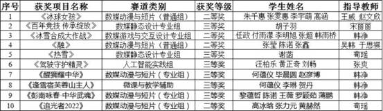 在參賽學生與指導教師的共同努力下,10項作品進入國賽(包括大數(shù)據(jù)應用組、人工智能實踐組、數(shù)媒動漫與短片組、數(shù)媒靜態(tài)設(shè)計專業(yè)組、微課與教學輔助組、數(shù)媒游戲與交互設(shè)計組),最終喜獲全國二等獎4項,全國三等獎6項。