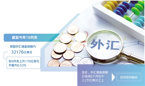 近日,國家外匯管理局公布的最新外匯儲備規(guī)模數(shù)據(jù)顯示,截至今年10月末,我國外匯儲備規(guī)模為32176億美元,較9月末上升170億美元,升幅為0.53%。至此,外匯儲備規(guī)模已連續(xù)6個月位于3.2萬億美元之上,總體保持穩(wěn)定。