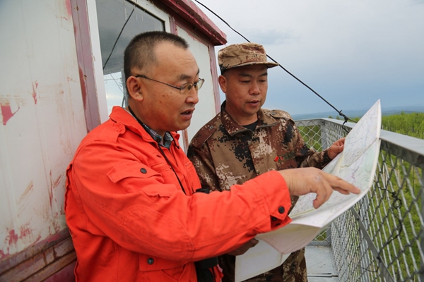 孫立森在向長(zhǎng)山林場(chǎng)黨支部書(shū)記關(guān)大安介紹塔周圍的地形、地勢(shì)、河流等特點(diǎn),以及周邊瞭望塔的分布情況(王力 攝)
