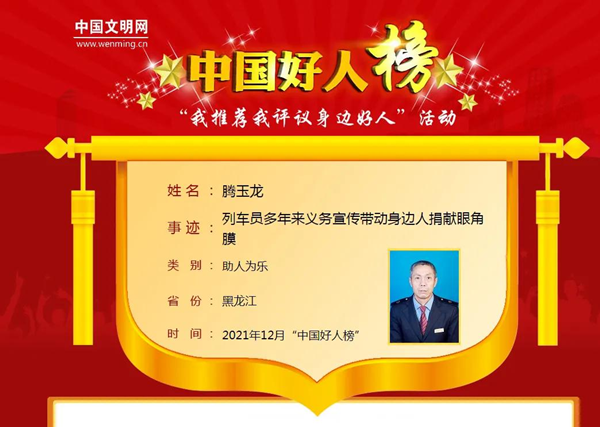 騰玉龍,鐵力市人,曾先后榮獲“龍江好人”“伊春好人”“最美鐵力人”等榮譽(yù)稱號(hào)。他曾多次捐贈(zèng)造血干細(xì)胞,挽救了3個(gè)人的生命。在他的帶動(dòng)下,他的家庭成為中國(guó)首個(gè)眼角膜、身體器官和造血干細(xì)胞捐獻(xiàn)志愿者家庭。騰玉龍同志入選2021年12月“中國(guó)好人榜”后,鐵力市精心組織策劃,動(dòng)員廣大干部群眾為典型點(diǎn)贊助力,組織全市各單位、各社區(qū)居民學(xué)習(xí)“中國(guó)好人”先進(jìn)事跡。