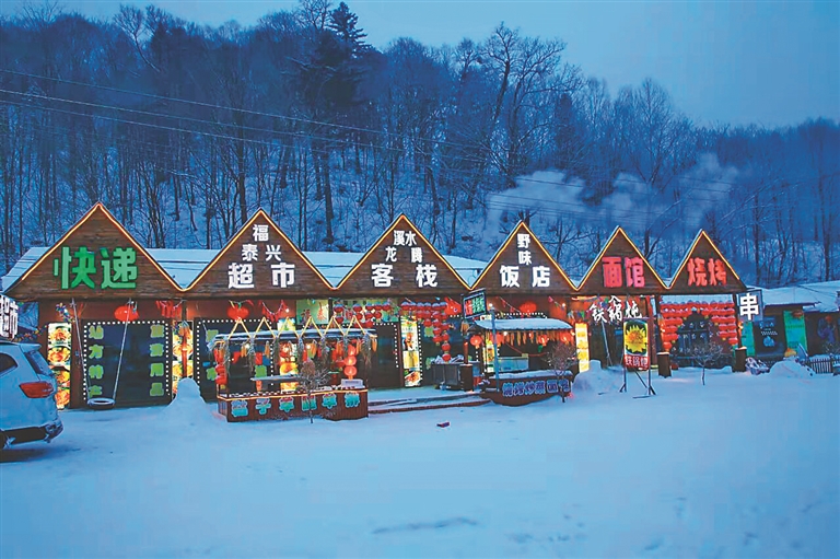 當我們抵達雪谷的時候,暮色已濃,天地間覆蓋了一片黑色的幕布。但雪谷中心街道上,聳立著由上千只大紅燈籠排列組合的拱形門,燈火輝煌,延續(xù)百米開外。門的頂端中央鑲嵌著“中國雪谷”四個金色大字,格外醒目。我們停下車拍照,并就近住宿,溫暖的火炕讓我們很快進入夢鄉(xiāng)。