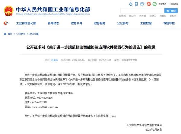 據(jù)工信部網(wǎng)站16日消息,工信部公開(kāi)征求對(duì)《關(guān)于進(jìn)一步規(guī)范移動(dòng)智能終端應(yīng)用軟件預(yù)置行為的通告》的意見(jiàn)?!锻ǜ妗诽岢?,生產(chǎn)企業(yè)應(yīng)確保除基本功能軟件外的預(yù)置應(yīng)用軟件均可卸載,并提供安全便捷的卸載方式供用戶選擇。全文如下:
