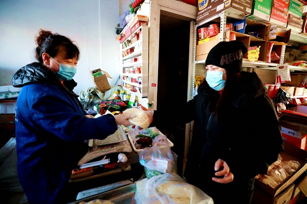 阿木爾林業(yè)局周周蔬菜水果店經營業(yè)戶周麗霞(左)向客戶銷售“依林河手搟面”(王力 攝)