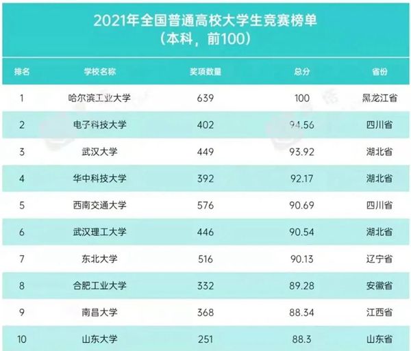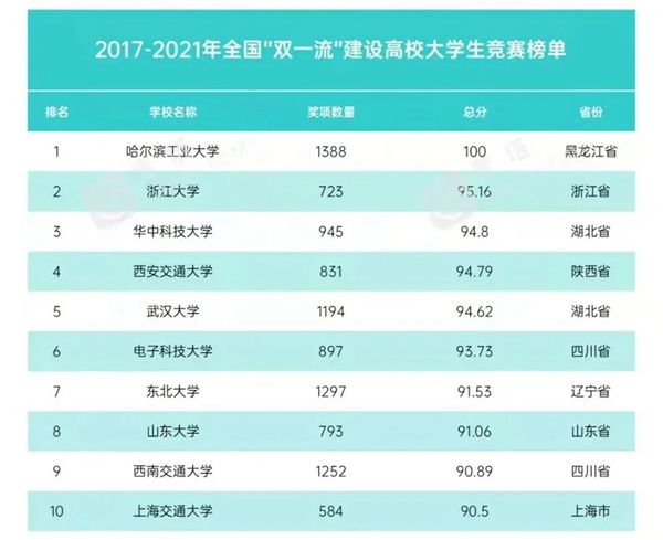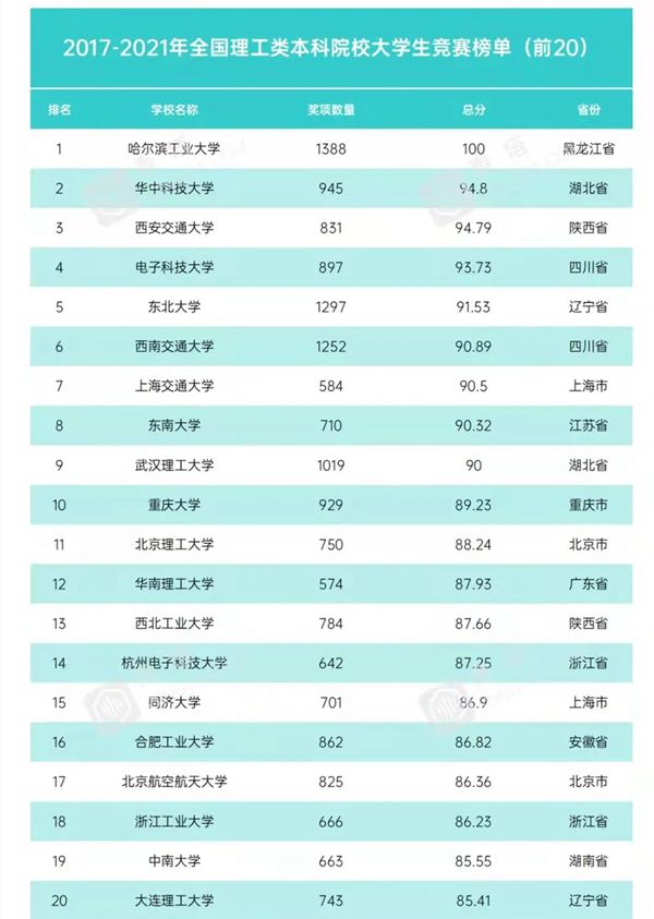 黑龍江經(jīng)濟(jì)網(wǎng)訊(黑龍江日報(bào)全媒體見習(xí)記者董廣碩 商祺)近日,中國高等教育學(xué)會高校競賽評估與管理體系研究工作組發(fā)布2021全國普通高校大學(xué)生競賽分析報(bào)告,全國共有1197所本科院校進(jìn)入2017—2021年本科榜單。哈爾濱工業(yè)大學(xué)以獲獎(jiǎng)數(shù)量1388項(xiàng)、總分100分獲得2017—2021年全國普通高校大學(xué)生競賽榜單榜首,以獲獎(jiǎng)數(shù)量639項(xiàng)、總分100分獲得2021年全國普通高校大學(xué)生競賽榜單榜首。這是哈爾濱工業(yè)大學(xué)連續(xù)3次獲得上述榜單冠軍。
