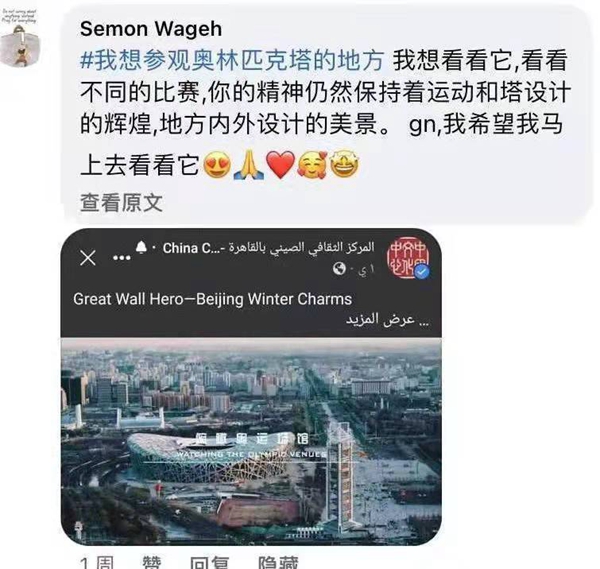 2022年年初,根據(jù)埃及社會(huì)、文化特點(diǎn)和民眾喜好,開羅中國(guó)文化中心創(chuàng)新推出了2022“北方冰雪旅游海外推廣季”之“我最想去的地方”線上評(píng)選活動(dòng),邀請(qǐng)埃及各界友人參與話題互動(dòng),在中心主題帖文下寫出自己最想去的中國(guó)省份(或城市)及原因,曬出旅游目的地圖片并打上話題標(biāo)簽等?;顒?dòng)一經(jīng)推出,即受到埃及民眾的廣泛關(guān)注,網(wǎng)友們紛紛在中心臉書帖文下留言并轉(zhuǎn)發(fā),評(píng)選自己“最想去的中國(guó)冰雪旅游勝地”,并熱情附上自己之前在華留學(xué)、訪問、旅游、生活的旅游體驗(yàn)和文化閱歷,活動(dòng)二次外溢效應(yīng)明顯,二次傳播效果良好,旅游推廣和文化傳播的效果遠(yuǎn)遠(yuǎn)高于預(yù)期?;顒?dòng)期間,該活動(dòng)