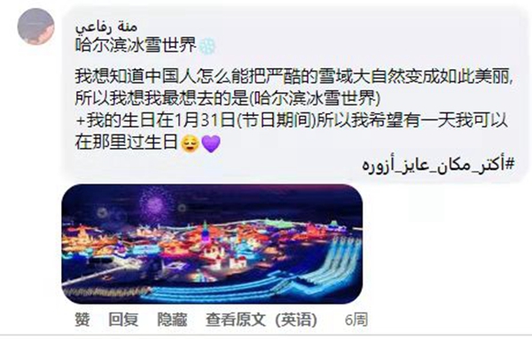 開羅中國(guó)文化中心臉書主頁超級(jí)粉絲艾曼·索比、曼娜·伊薩姆和羅飛三位網(wǎng)友獲得了優(yōu)秀評(píng)論獎(jiǎng)。艾曼·索比在留言中提出想去黑龍江大慶泡雪地溫泉;曼娜·伊薩姆在評(píng)論里說她想去哈爾濱極地公園游玩,想去牡丹江鏡泊湖的冰瀑跳水,想去吉林的查干湖看看;羅飛表示想到哈爾濱冰雪大世界去過生日。眾多網(wǎng)友也紛紛曬出了自己最想去的地方,新聞與媒體從業(yè)者加達(dá)·阿里想先去遼寧的滑雪場(chǎng),然后再去采摘丹東的草莓;來自明亞省的緒瑪·穆斯塔法表示想去內(nèi)蒙古東方冰雪小城阿爾山旅游;畢業(yè)于蘇哈格大學(xué)的薩蒙·瓦赫想去北京看奧林匹克塔等。網(wǎng)友們各抒己見,暢想去中國(guó)的夢(mèng)幻旅程。