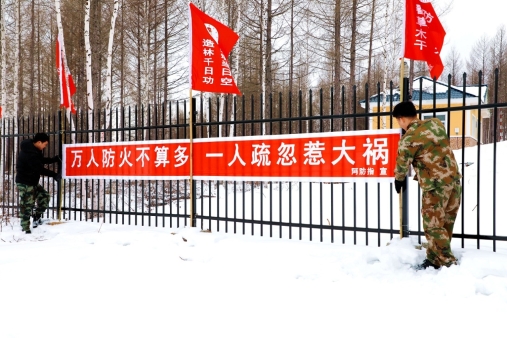 紅旗林場職工在第一管護站掛宣傳防火宣傳條幅(王力 攝)