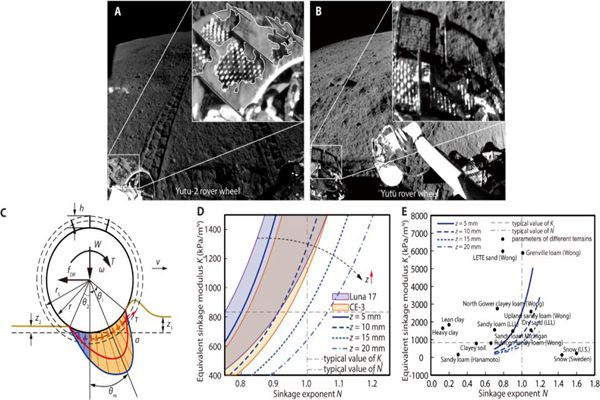 團(tuán)隊成員根據(jù)月球車車輪與月面作用的信息和地面力學(xué)模型估計了月壤的力學(xué)特性,結(jié)果表明,月壤風(fēng)化層的承壓特性與地球上的干沙和沙壤土類似,與美國阿波羅計劃中的典型月壤相比具有更強(qiáng)的承壓特性。在多個不同地點(diǎn)的圖像中,觀察到“玉兔二號”車輪粘附有大塊團(tuán)狀土壤,而“玉兔號”車輪基本不存在粘土現(xiàn)象,這表明,嫦娥四號著陸區(qū)附近月壤內(nèi)聚力較大,其原因可能是包含較高比例的凝集物,使土壤顆粒經(jīng)車輪碾壓更易團(tuán)聚。