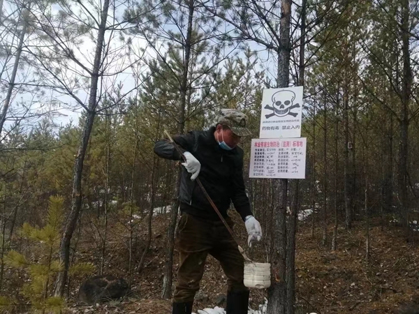 采取科學(xué)有效的防治方法,根據(jù)不同區(qū)域、不同特點(diǎn)投放不孕劑和涂抹防啃劑進(jìn)行防治。為防止人畜中毒,提前張貼林場(chǎng)鼠害防治公告、在防治區(qū)內(nèi)樹立警示標(biāo)牌,避免人員、牲畜進(jìn)入投放鼠藥區(qū)域。