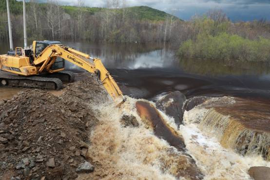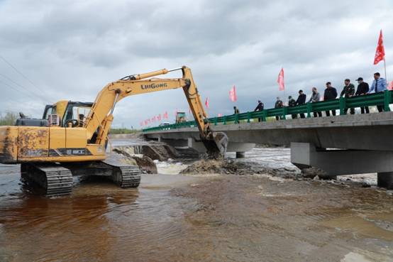 阿木爾林業(yè)局調(diào)派大型機械設備,挖開楚龍溝河大橋臨時便道,進行泄洪,確保G111國道安全(王力 攝)