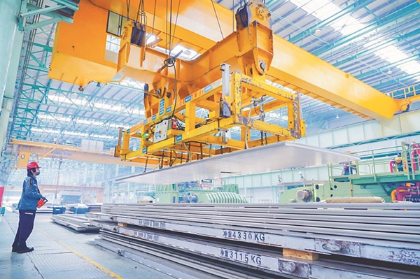 生產(chǎn)人員對軋制完成的鋁板進(jìn)行吊運(yùn)。 黑龍江日報(bào)全媒體記者 韓麗平攝