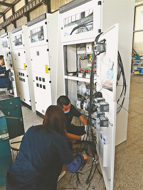 在生產(chǎn)車間,記者看到,工作人員正熟練地組裝配電設(shè)備。該公司擁有現(xiàn)代化廠房2.2萬平方米,實現(xiàn)了工業(yè)化和信息化高度融合。