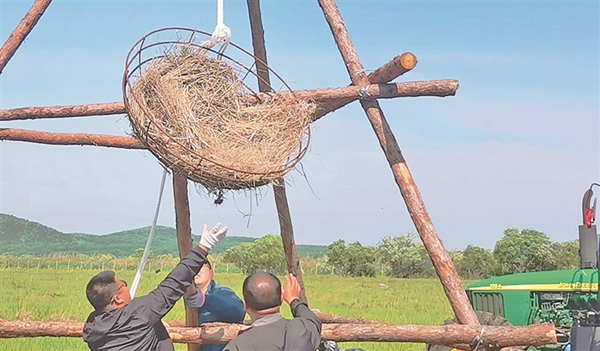 吊裝人工鳥(niǎo)巢。郭麗偉 付國(guó)新攝