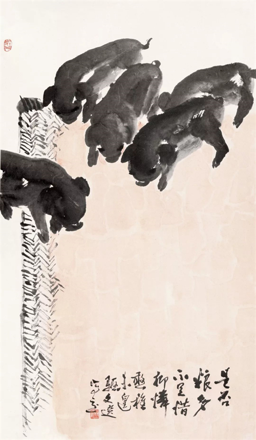 湯文選的人物、山水、花鳥、墨虎等一系列作品,融會(huì)著、貫穿著“三種傳統(tǒng)”?;螂[或顯,或化解之,或凝聚之,或熔裁之,或獨(dú)造之。“三種傳統(tǒng)”,可概括為現(xiàn)實(shí)主義在中國畫發(fā)展歷程中的三段式,亦曰交叉出現(xiàn)的不同歷史內(nèi)涵、文化反映的三種藝術(shù)狀態(tài):首先,是古代現(xiàn)實(shí)主義傳統(tǒng)——“外師造化,中得心源”。其二,是“五四”現(xiàn)實(shí)主義傳統(tǒng)——融合西法,崇尚寫實(shí)。其三,是新中國成立后倡導(dǎo)的革命現(xiàn)實(shí)主義傳統(tǒng)。深入火熱斗爭,深入工農(nóng)兵。學(xué)習(xí)延安木刻,學(xué)習(xí)民間年畫,學(xué)習(xí)蘇聯(lián)油畫現(xiàn)實(shí)主義的創(chuàng)作方法(50年代)。其后,“一手伸向生活,一手伸向傳統(tǒng)”(60年代)。在以上“三種傳統(tǒng)”的交匯點(diǎn)上,伸延出湯文選早期和中期的現(xiàn)實(shí)主義創(chuàng)作之路。湯文選中國畫藝術(shù)的現(xiàn)實(shí)主義,其主要特征為積極的入世態(tài)度,強(qiáng)烈的人文主義色彩,個(gè)性、民族性與時(shí)代性的完美統(tǒng)一,以及嚴(yán)肅的歷史使命感。