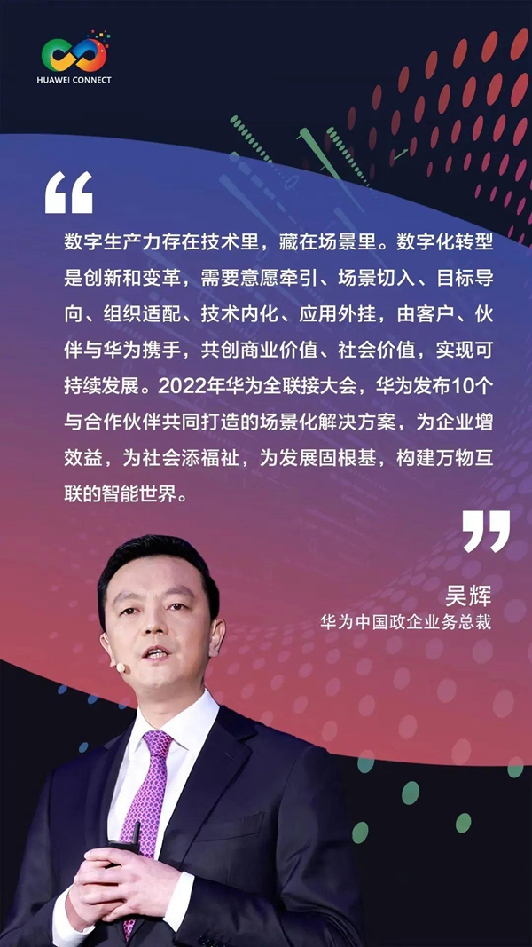 當(dāng)前,我國的數(shù)字化已經(jīng)進(jìn)入快車道,釋放數(shù)字生產(chǎn)力正當(dāng)其時。而“數(shù)字生產(chǎn)力就存在技術(shù)里,藏在場景里?!被诖?,華為中國政企業(yè)務(wù)總裁吳輝在會上發(fā)表了題為《為行業(yè)找技術(shù),深入場景創(chuàng)造價(jià)值》的主題演講,重點(diǎn)分享了華為基于多年的探索和實(shí)踐總結(jié)出的行業(yè)數(shù)字化轉(zhuǎn)型的方法論和企業(yè)轉(zhuǎn)型成功秘訣。