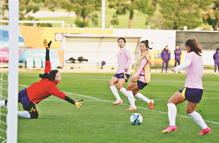 7月10日歸隊的王霜已完全融入,過障加速、接球射門,王霜彈無虛發(fā)。在6對6半場演練中,助理教練馬曉旭加入到王霜率領的黃隊,與唐佳麗、張馨所在的紅隊展開對攻大戰(zhàn)??焖俚墓シ擂D換、漂亮的進球讓看臺上的球迷興奮不已,有球迷甚至打開了手機直播。