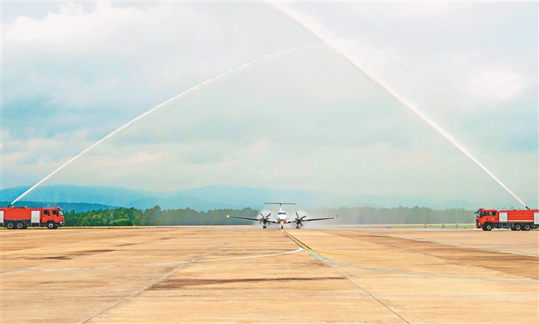 伴隨著飛機(jī)的轟鳴聲,命名為“林都號”的國王350飛機(jī)平穩(wěn)降落林都伊春,緩緩駛向林都機(jī)場5號停機(jī)坪。當(dāng)飛機(jī)落地脫離跑道后,左右兩側(cè)的消防車開始噴射水霧,兩束水霧相互交錯(cuò),以“水門禮”熱烈歡迎乘坐“林都號”來伊春的游客。