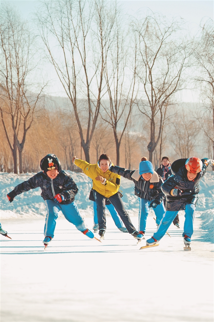 楊揚(yáng)(左二)在冰場(chǎng)上輔導(dǎo)孩子們滑冰。 圖片由受訪單位提供