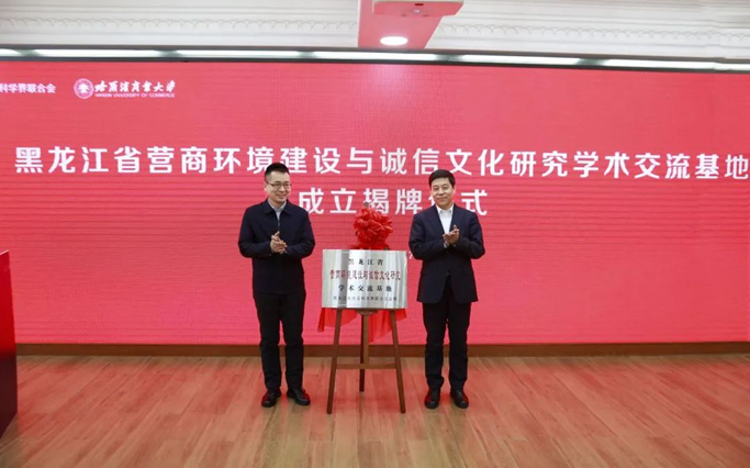 黑龍江省社會科學界聯(lián)合會黨組成員、副主席王宏宇與孫先民共同為“黑龍江省營商環(huán)境建設與誠信文化研究學術交流基地”揭牌。