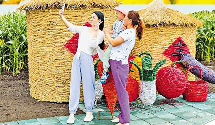 游客在稻草編織藝術品前打卡拍照。裴文彬攝