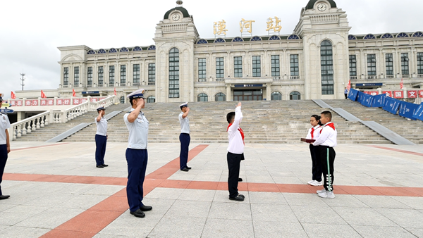 在國旗下,漠河市邊境檢查站代表陳澤和“全區(qū)十佳駐村干部”王成龍用自己生動(dòng)的故事為在場的每位少先隊(duì)員們上了一堂生動(dòng)的國防教育課,漠河市的少先隊(duì)員代表王涵在國旗下表達(dá)了對祖國的熱愛和對戍邊工作者們的敬佩。團(tuán)省委副書記陳海萍在講話中鼓勵(lì)少先隊(duì)員要學(xué)習(xí)漠河戍邊工作者們的堅(jiān)韌不拔和無私奉獻(xiàn),要立足祖國最北方志存高遠(yuǎn)、勤奮學(xué)習(xí)、錘煉品德、強(qiáng)健體魄,敢于創(chuàng)新、富于創(chuàng)意、樂于創(chuàng)造,要沿著“入隊(duì)、入團(tuán)、入黨”的“人生三部曲”奮力前進(jìn),為推進(jìn)中國式現(xiàn)代化、實(shí)現(xiàn)強(qiáng)國復(fù)興偉業(yè)貢獻(xiàn)青春力量。