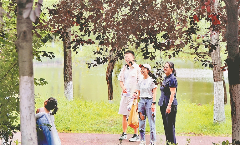 周末,雙鴨山市市政廣場附近的安邦河畔,花草樹木郁郁蔥蔥,風景如畫。