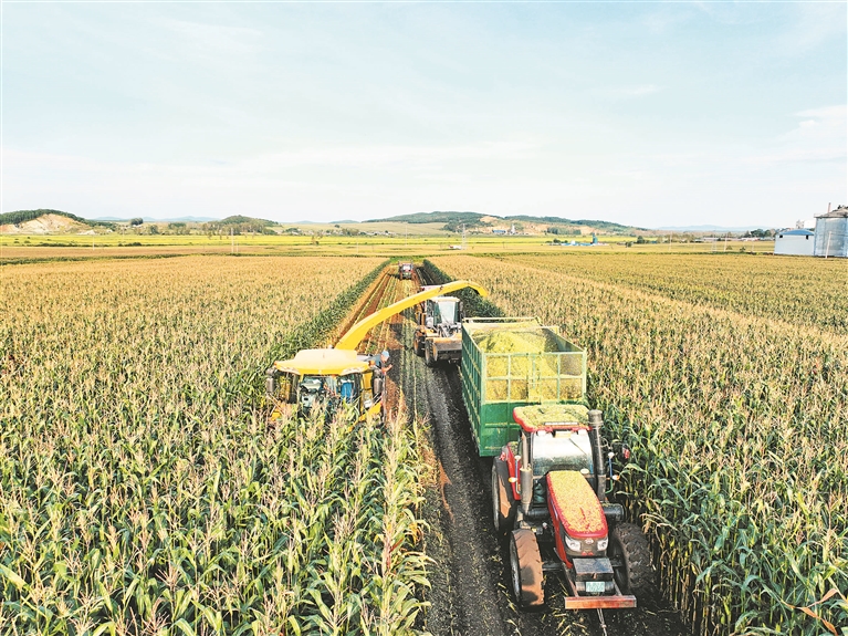 青貯玉米是八五一一農場有限公司2.4萬頭奶牛越冬的重要口糧。經過切碎、加工后,發(fā)酵制作成青貯飼料的玉米干物質淀粉含量高、營養(yǎng)好,是公認的優(yōu)質飼料。青貯玉米既為奶牛提供了優(yōu)質口糧,又減少了因焚燒玉米秸稈帶來的環(huán)境污染,為各牧場增收奠定了基礎,更實現了畜牧業(yè)綠色低碳高質量發(fā)展。