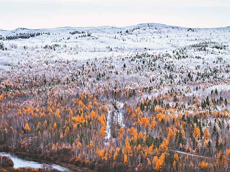 從空中俯瞰最北邊城儼然已經(jīng)進(jìn)入冬季。眼下正值漠河的金秋時(shí)節(jié),突如其來(lái)的降雪為北國(guó)秋色增添了別樣美景。松枝上布滿(mǎn)了厚厚的雪球,山林之間的秋色景觀與皚皚白雪同框,火車(chē)在白雪森林間穿行而過(guò),令南方游客驚嘆不已。本報(bào)記者 張磊攝
