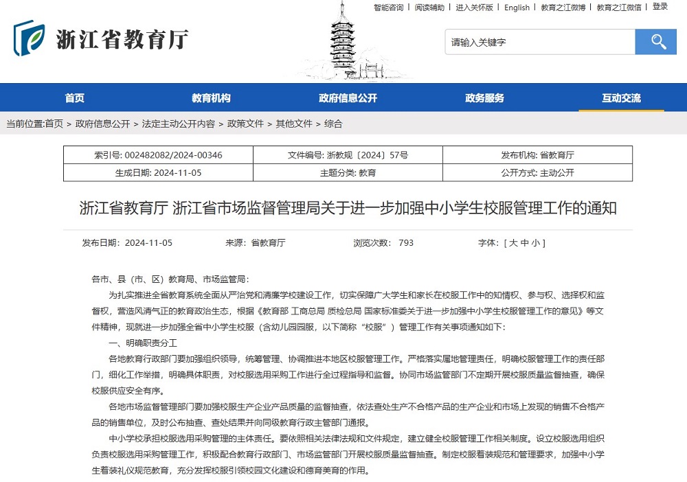 作為服裝產(chǎn)業(yè)發(fā)達省份,浙江省一直注重校服質量。如2014年浙江省教育廳聯(lián)合浙江省質量技術監(jiān)督局發(fā)布《關于進一步加強學生服裝和床上用品管理工作的通知》;2018年,浙江省質監(jiān)局聯(lián)合教育廳、工商局聯(lián)合發(fā)布了《浙江省學生服質量提升行動工作方案》;2022年10月,浙江省《教育收費政策(2022年)》規(guī)定學校收取服務性收費和代收費,堅持學生自愿和非營利原則,不得與學費、住宿費合并統(tǒng)一收取,不得從中牟利。