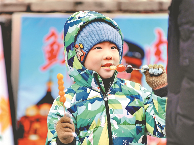12月1日,哈爾濱市道外區(qū)南二道街附近,許多游客購(gòu)買(mǎi)、品嘗美味的糖葫蘆。這些糖葫蘆有很多口味,包括山楂、葡萄、菠蘿、大棗、桔子、草莓等,有的還在里面添加了糯米、核桃等餡料。冬天,吃一串晶瑩剔透、甜里帶酸的糖葫蘆,絕對(duì)是一種享受。