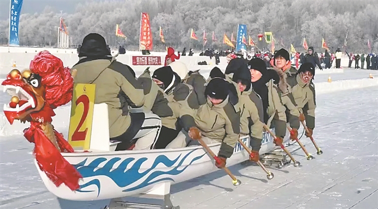 伴隨著動感的音樂聲和歡呼聲,冰面之上百釬齊發(fā),龍舟疾馳。隊(duì)員們劃槳動作整齊劃一,鑼鼓聲、吶喊聲形成了一曲激昂的冬日交響樂。當(dāng)冠軍隊(duì)伍沖線的一刻,現(xiàn)場爆發(fā)出更熱烈的歡呼聲,豪邁的氣勢與聲浪響徹萬寶湖上空。