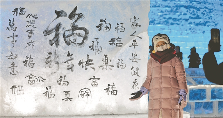 1月16日,為喜迎乙巳蛇年的到來,哈爾濱冰雪大世界在園區(qū)打造一座許愿冰墻,上面寫滿各種祝福,為新年增添喜氣。本報(bào)記者 張澍攝