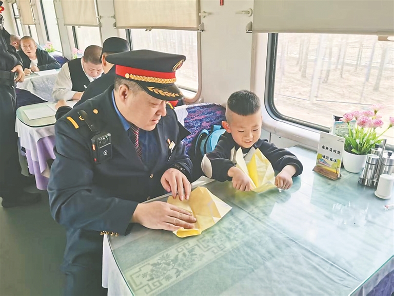 本報訊(張蔚萌 王夢 記者 王迪)近日,由鄭州開往海拉爾的K927次列車從昌圖站駛出后,列車長孫志強(qiáng)接到12306轉(zhuǎn)發(fā)的緊急尋人求助工單。經(jīng)過與客服溝通了解后得知,旅客劉玲玲帶6歲兒子劉俊澤從沈陽北站乘車至昌圖站,因下車時忙于整理行李,將座位上熟睡的孩子遺落在列車上。列車長孫志強(qiáng)通過對講機(jī)立即組織各節(jié)車廂列車員尋找孩子,確定孩子位置后迅速趕到現(xiàn)場。為了緩解孩子的緊張情緒,他化身“臨時爸爸”,將孩子帶到了餐車,不僅準(zhǔn)備了一些自帶的小零食,還陪孩子一起折紙飛機(jī)。當(dāng)列車停靠長春站后,孫志強(qiáng)按照其母親劉玲玲的要求,將孩子安全移交給長春站工作人員,等待其家屬前來接領(lǐng)。