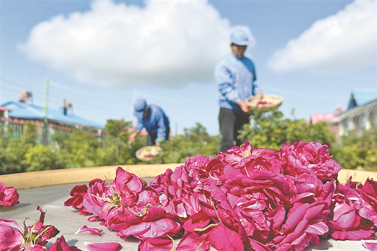 “清晨的玫瑰花帶著露水,香氣最濃,品質(zhì)也是最好的?!闭f話的是采摘工人馬鳳華,她手法嫻熟,一邊將飽滿嬌艷的玫瑰花朵輕輕摘下放入竹籃,一邊介紹。馬鳳華和另外兩名工人穿梭在百畝玫瑰種植地中,玫瑰花瓣上晶瑩的露珠沾濕了她們的褲腳,她們的身影與綻放的玫瑰,構(gòu)成了一幅美麗的田園畫卷。