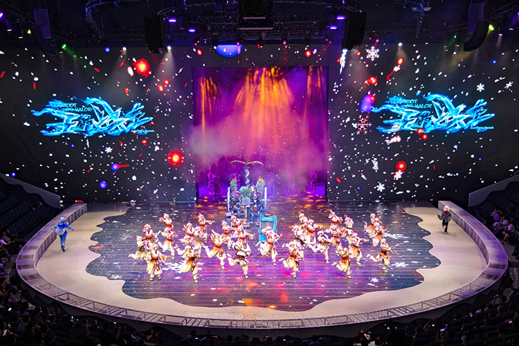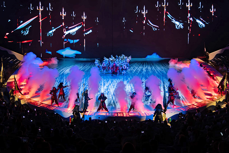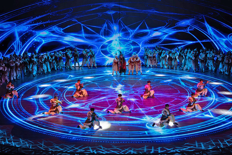 全新的演出以游戲玩家視角展開(kāi),當(dāng)游戲開(kāi)始,巨大的環(huán)形地幕瞬間點(diǎn)亮,蒼茫的北境雪原鋪展開(kāi)來(lái),激光投影在穹頂交織出流動(dòng)的光幕,與升騰的煙霧交融,千年前的部落場(chǎng)景躍然眼前。