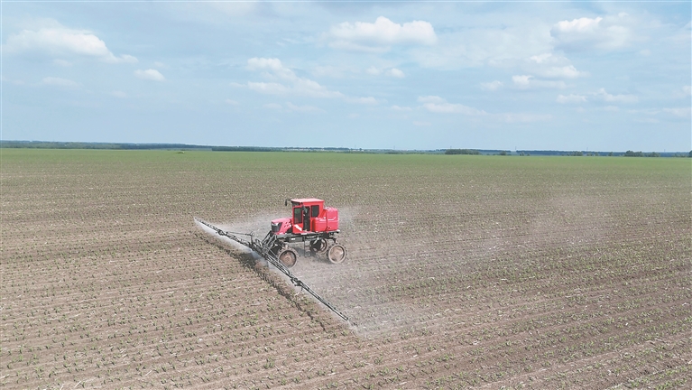 在慶安縣建民鄉(xiāng)玉米種植地塊,兩臺高桿噴霧機與一臺大馬力拖拉機協(xié)同作業(yè),成為田間“主角”。通過可伸展機械臂,一臺高桿噴霧機單次可為40行玉米精準(zhǔn)噴施藥劑,同時最大程度降低風(fēng)力影響,高效完成滅草任務(wù)。“我們立豐家庭農(nóng)場有9000多畝地,現(xiàn)在一臺高架車一天能作業(yè)1000畝,4臺機器兩三天就能完成作業(yè)。”建民鄉(xiāng)農(nóng)戶劉立豐感慨道,“小農(nóng)機一天也就作業(yè)百八十畝,這大農(nóng)機速度快了10倍。”在慶安縣國家現(xiàn)代農(nóng)業(yè)科技示范展示基地的水稻田里,無人機手正操控滿載分蘗肥的無人機平穩(wěn)穿梭。依托北斗導(dǎo)航精準(zhǔn)定位,肥料被均勻噴灑在稻田中?!皺C械化施肥每畝僅需0.3元,成本是人工撒施的1/5,效率更是傳統(tǒng)人工的5倍以上?!睉c安縣農(nóng)業(yè)技術(shù)推廣中心主任范軍介紹,機械噴灑不僅降低成本,更實現(xiàn)了肥料的精準(zhǔn)分布,讓每株秧苗都能均衡“吃”到養(yǎng)分。