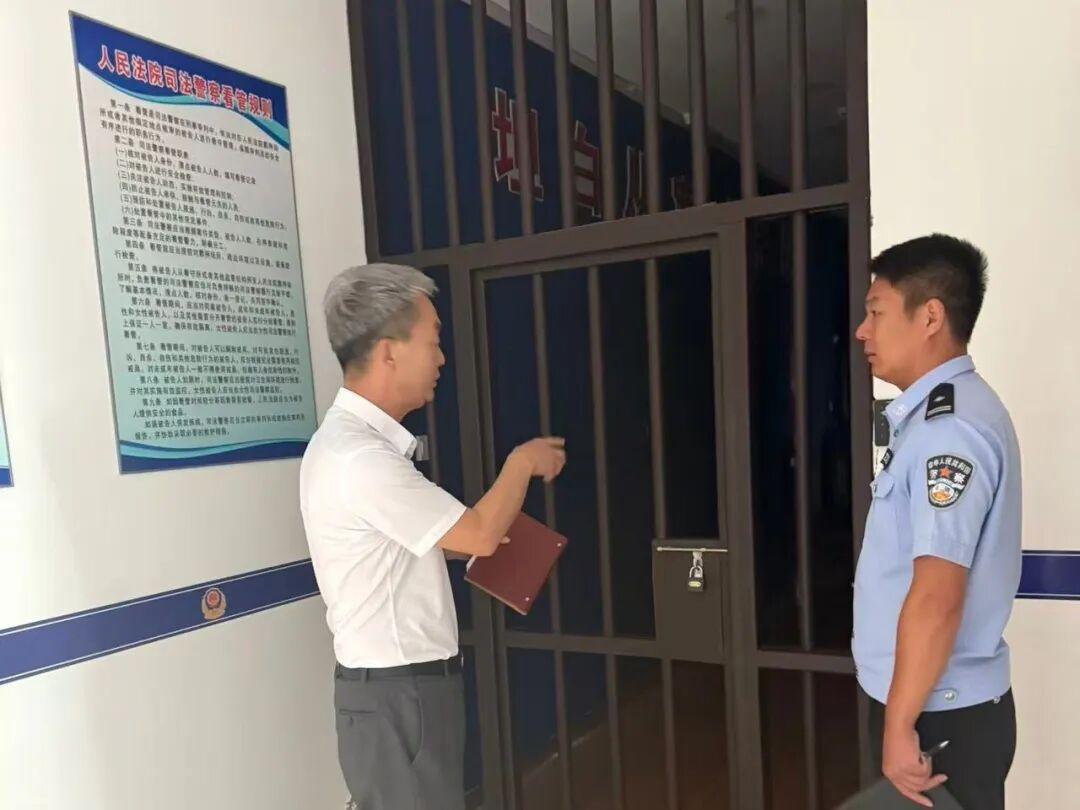 此次檢查遵循“不留死角、不留盲區(qū)、不留隱患”的原則,聚焦警務安全核心,深入院機關、派出法庭開展細致全面排查,實地查看用水用電、安檢設備、安檢通道、監(jiān)控設備、消防設施等關鍵部位,對安檢流程、防暴器材使用熟練度及突發(fā)事件應急處突能力現(xiàn)場進行測試,對派出法庭矛盾易發(fā)點的人群密集接待區(qū)及檔案資料區(qū)重點進行檢查,杜絕安全隱患。
