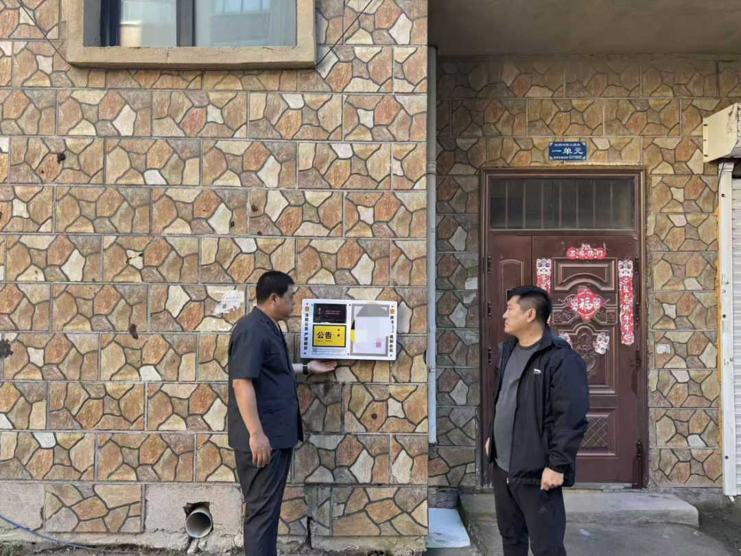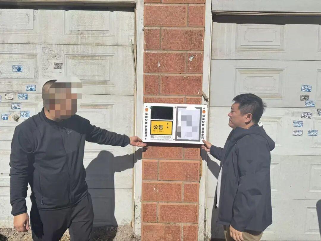 海倫市人民法院在執(zhí)行趙某與某公司買賣合同糾紛一案中張貼拍賣房屋公告(鄧育彤 攝)