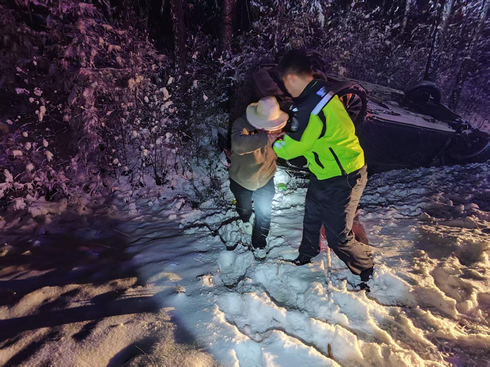 到達現(xiàn)場后,民警立即下車進行查看,發(fā)現(xiàn)一輛外地車牌的小型汽車側(cè)翻在3米的道路下,一對中年夫妻正在車內(nèi)拿取行李箱。見此情形,民警立即向夫妻施以援手,將這對夫妻從溝中拉拽上來,在確認二人安全后了解到,二人駕駛車輛從呼瑪趕往漠河,因?qū)β窙r不熟,加之駕駛?cè)嗽诒┞访骜{車經(jīng)驗不足,操作不當(dāng),導(dǎo)致車輛側(cè)翻。